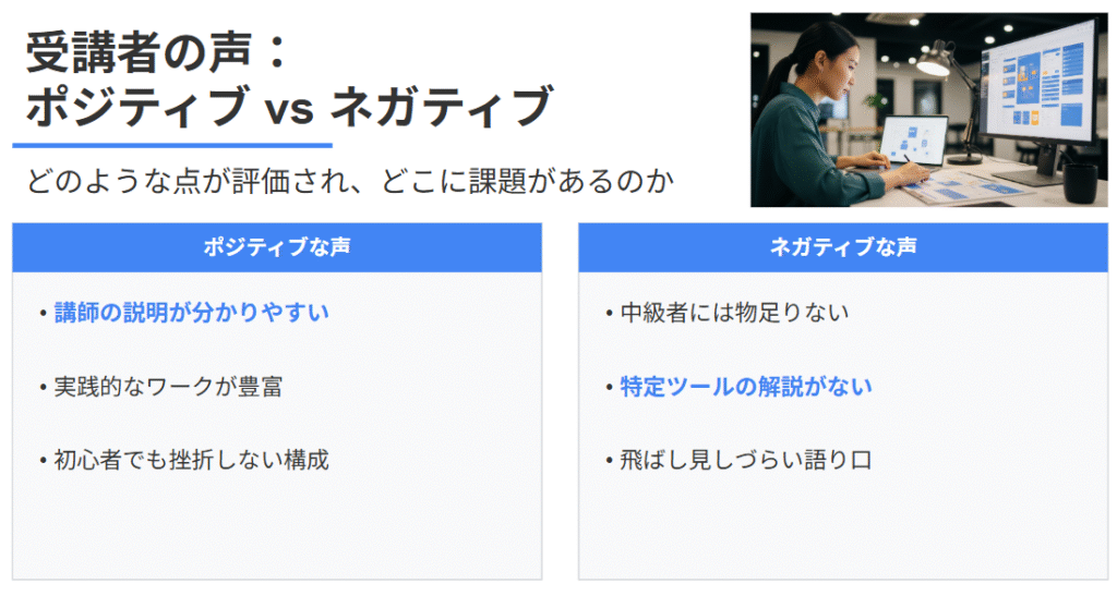 受講者の口コミを総まとめすると、ポジティブな声とネガティブな声がそれぞれ存在します。