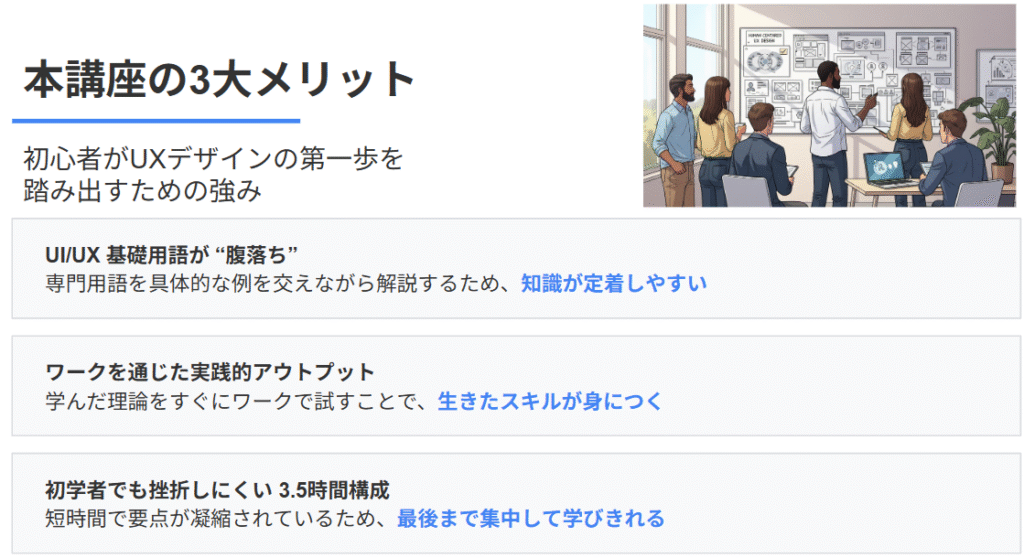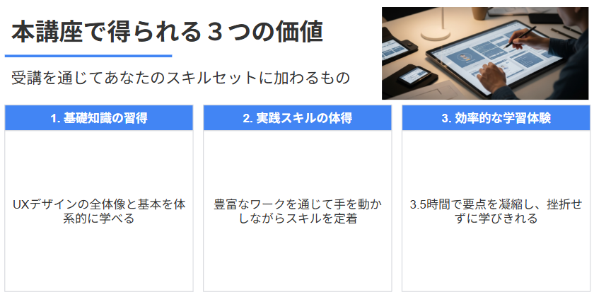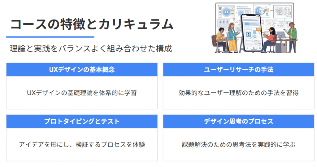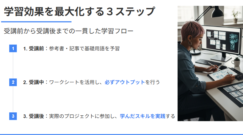 これらの内容を通じて、受講者はUXデザインの全体像を把握し、実際のプロジェクトに応用できるスキルを身につけることができます。