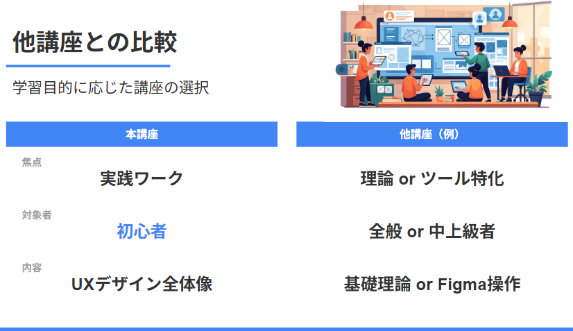 この講座を他の人気UX講座と比較することで、どのような違いがあるのかを明確にすることができます。