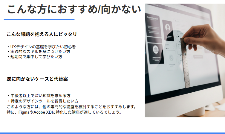 しかし、今回の講座はUXデザインの全体像を学ぶことができるため、基礎をしっかり固めたい方に向いています。